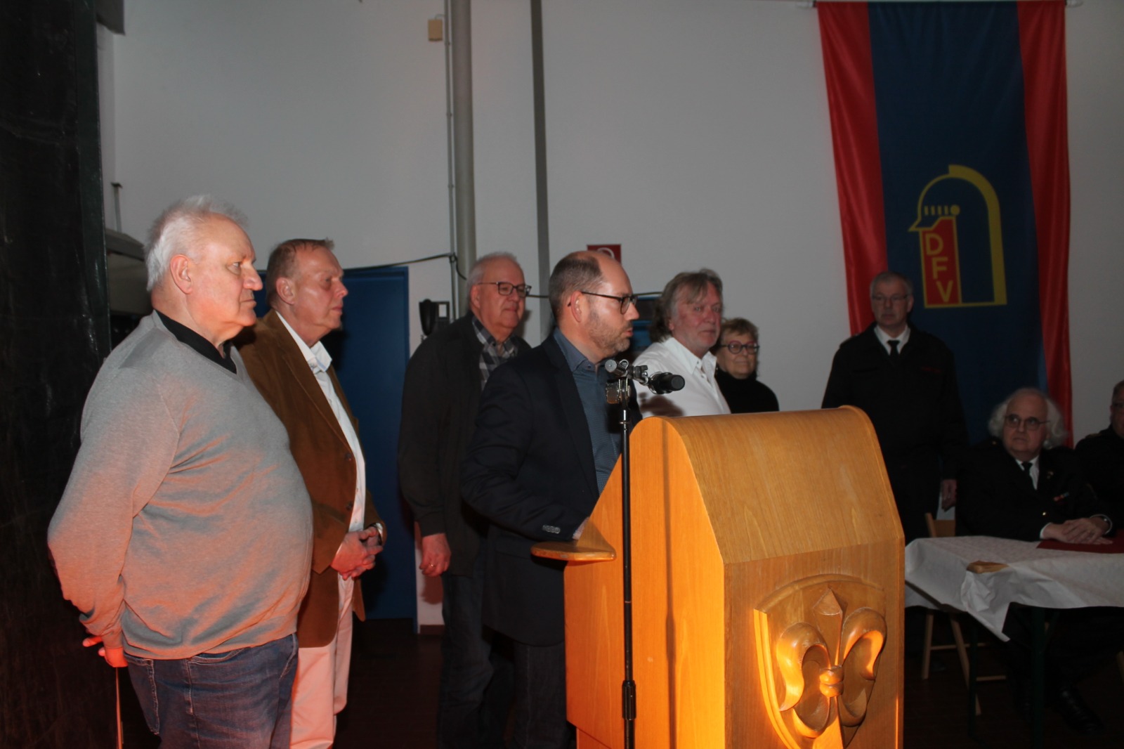Nach der Messfeier versammelten sich alle Mitglieder und Gäste im Bruxhof. Der Löschgruppenführer Michael Heyer begrüßte alle Anwesenden und berichtete aus dem Geschäftsjahr 2025. Der Start des Jahres war turbulent, nach wenigen Minuten folgte der erste Alarm nach Grefrath und kurze Zeit später ein zweiter Brand in Mülhausen. Bis Jahresende sollten es 79 Einsätze werden, viele davon als Gesamtwehralarm, wo man sich immer auf die LG Mülhausen verlassen konnte, wie z. B. diverse Wohnungsbrände oder ein schwere Verkehrsunfall mit einem Linienbus im Sommer zeigten. Dazu zählen auch die Einsätze im Kreisgebiet, wo die in Mülhausen stationierten Ölsperren zum Einsatz kamen. Das Fahrzeug hierfür (KEF), steht kurz vor dem Tausch gegen ein neues Fahrzeug, welches der Kreis Viersen beschafft hat.